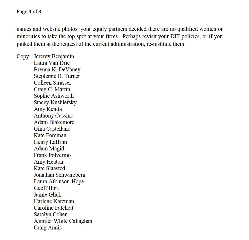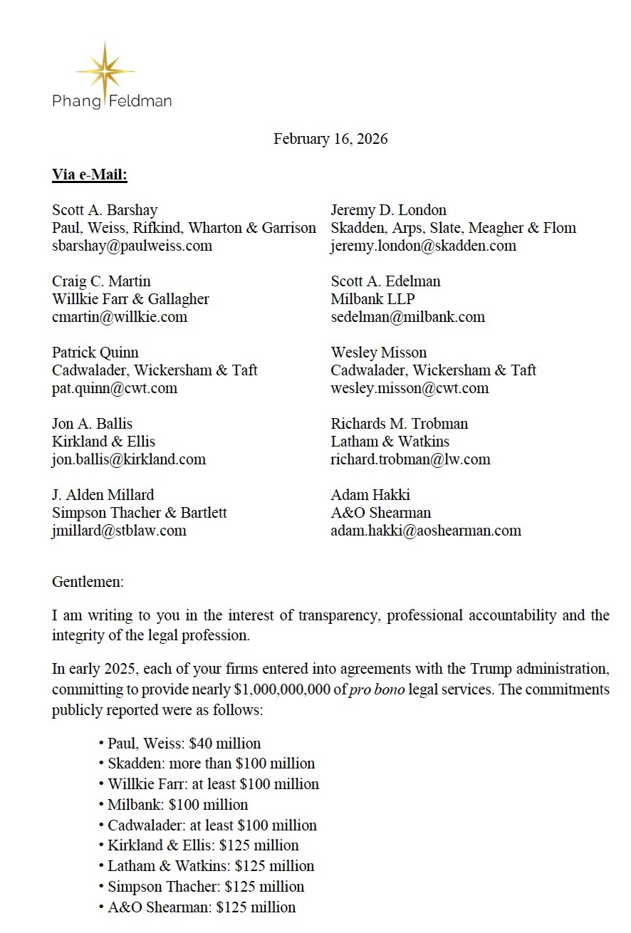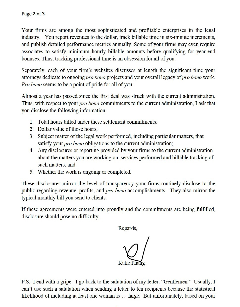 So we get to the purpose of this column: I’m sending an open letter to each of these law firms asking for straightforward information about their settlements with the Trump Administration. You can find the letter here: